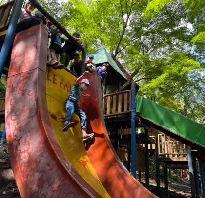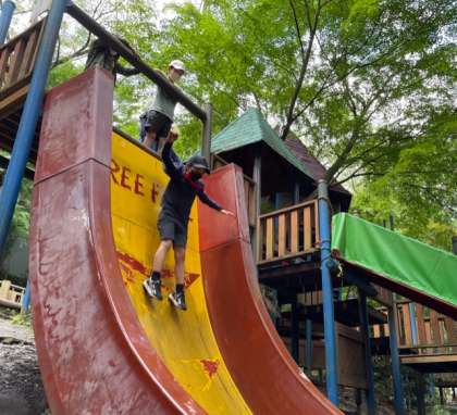 人気の遊戯施設「トムソーヤ 冒険の森」のすべり台です。直角のような急斜面に挑戦する子も・・・!