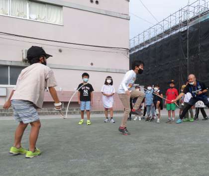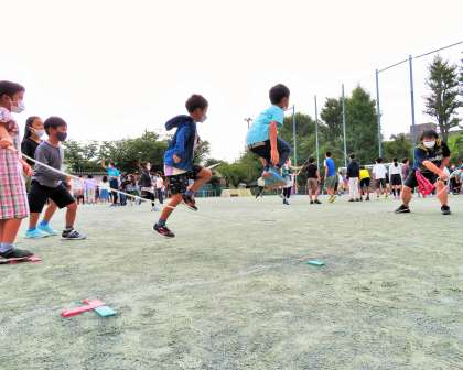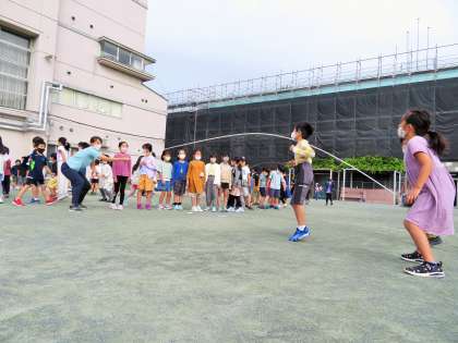 今日は、2・3・5年生の体育朝会です。長縄跳びは、学級のチームワークづくり、運動感覚づくりにはとてもよい運動種目なので全校で取り組みます。