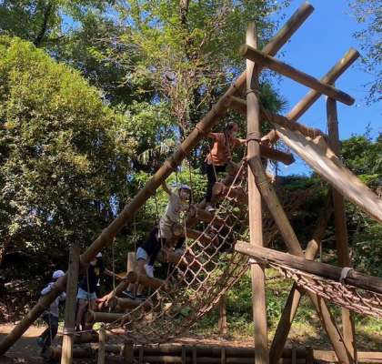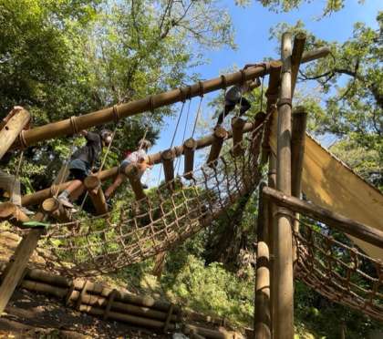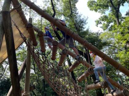 こちらも難所のすべり台に向けて、ゆらゆら揺れる丸太を登っていきます。