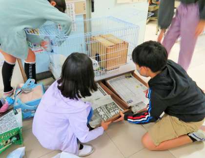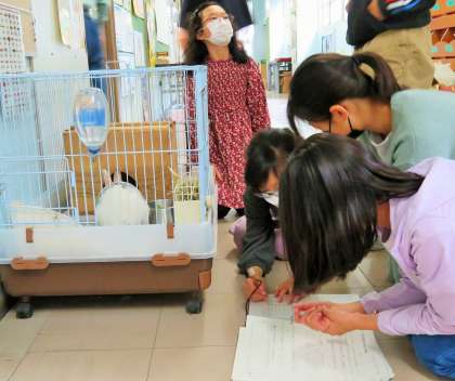 飼育委員の子どもたちは、ウサギのお世話をしてくれています。ウサギ小屋の掃除をはじめ、干し草とウサギの餌、新しい水を与えています。最後に、ウサギの健康状態も記録して引き継いでいます。