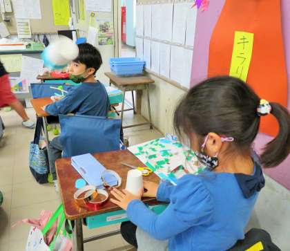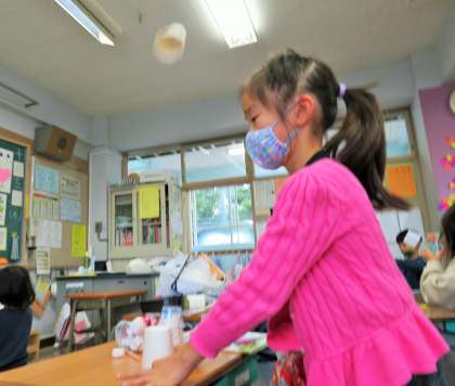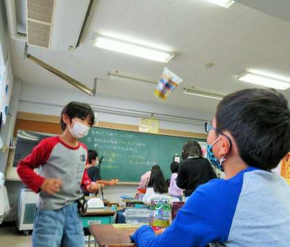 生活科の学習で、自分のおもちゃを作っています。もっと高く・・・!