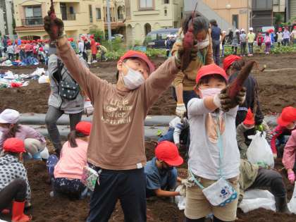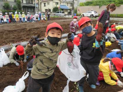 「こんな大きなおいもが取れたよ!」と、掘ったさつまいもを誇らしげに掲げていました。子どもたちは、顔を輝かせながら学校に帰ってきました!