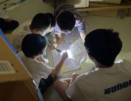 写真は、6年生のお店の様子です。「夜をめぐる脱出ゲーム」、「立入禁止区域」です!