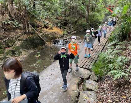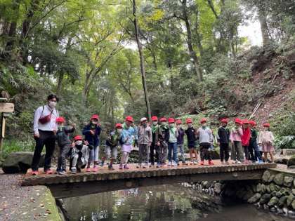 今日は3年生の社会科見学で「世田谷めぐり」です。さわやかなお天気に恵まれ、最初の見学地は等々力渓谷です。
