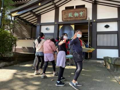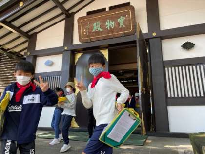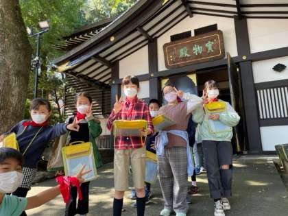 宝物殿に入りました。こちらは写真撮影が禁止です。1階には、5月の例祭「くらやみ祭り」で使われている大きな直径2メートルぐらいの大きな大太鼓が片側にずらりと並んでおり、もう一方には、やはり例祭で使われているお神輿がズラッと並んでいました。どちらもとっても大きいのでびっくりです!
