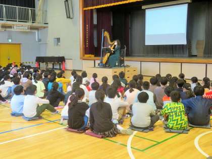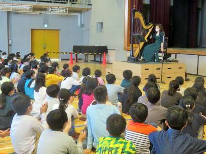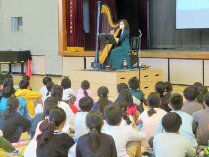 5,6年生の子どもたちは「ハープミニコンサート」を体育館で鑑賞しました。「Haunted Harpist」として活躍されているハナさんをお迎えして、ハープの生演奏を披露していただきました。