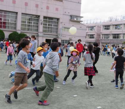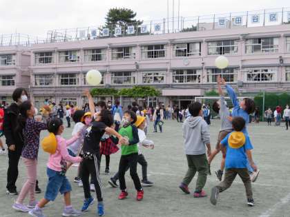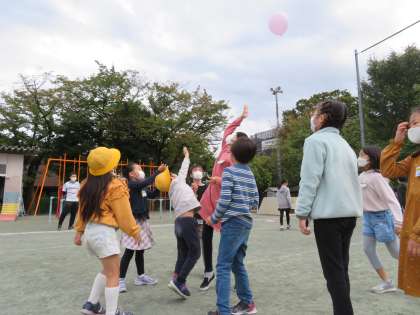 写真は、「風船バレー」で遊んでいる班の様子です。