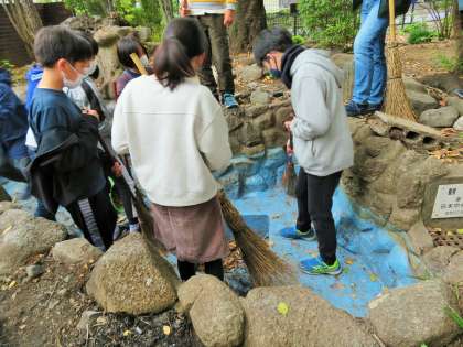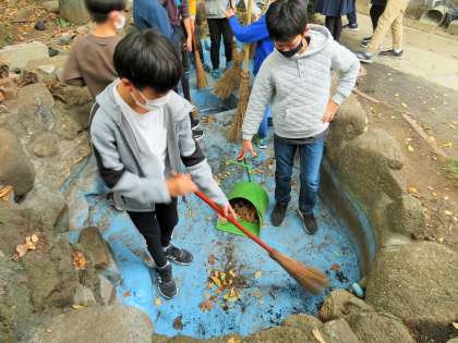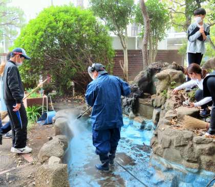 愛鳥園のビオトープを綺麗に掃除しています。最後は、主事の原島さんが高圧洗浄機で仕上げを行いました。