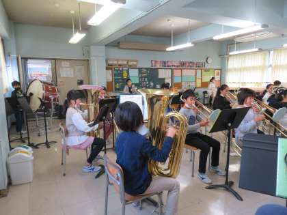 金管バンドの皆さんは、新たな目標である「世田谷区立小学校管楽器発表会」に向けて、練習に取り組んでいます。音楽室に入ると、いつも「おはようございます!」と、視線を合わせて温かいあいさつがあり爽やかな気持ちになります。