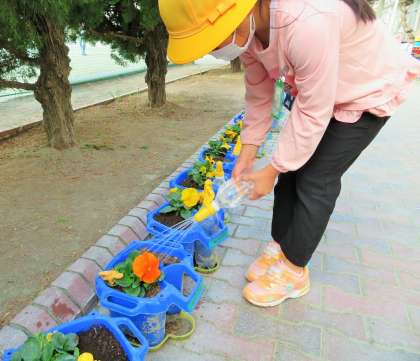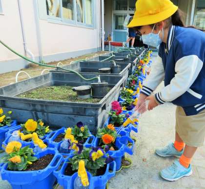 1年生は登校後にビオラ・チューリップの水やりをしています。綺麗な花が長く咲きますようにと気持ちを込めながら水やりをしています。水やりのタイミングは、朝のうちがベストです。朝から、日が高くなるまでのあいだ、比較的涼しい時間帯のうちに、水やりを行うのがコツです。