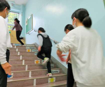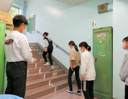 本日は雨のため、校舎内でできるスペシャルメニューです。まずは階段をリズミカルに走り上がります。しっかりと腕を振り、フォームを意識しながら行っています。