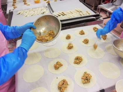 短い時間でたくさん作らないといけないこと、皮が重なっていると揚がりにくいことからヒダを付けずに作っています。