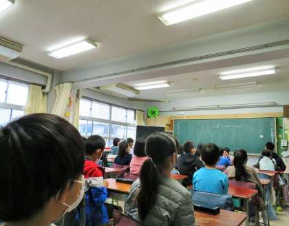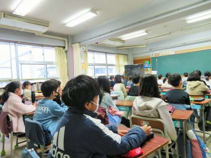 写真は、全校朝会の話を聞いている4年生、4年生、5年生の様子です。