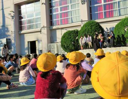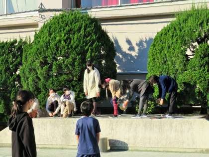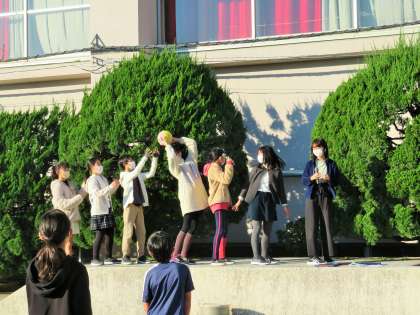 今日の児童集会は、集会委員会による「プレゼントフォーユー クリスマス集会」です。まずは、ルール説明です。プレゼントのボールを頭の上から、そして股の下から送っていき、早くゴールに送ったクラスが1位です。
