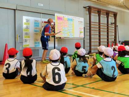 授業のめあては、「グループで考えた動きを友達に教えて、お店屋さんを楽しもう」です。
