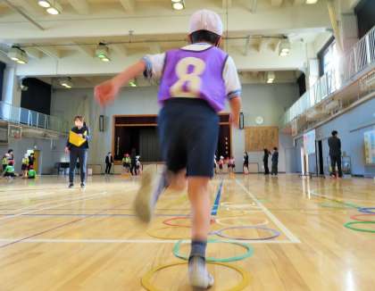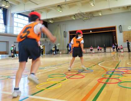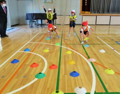 写真は、ケンステップゾーン、マーカーゾーンのお店屋さんで運動遊びをしている様子です。