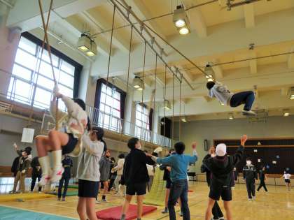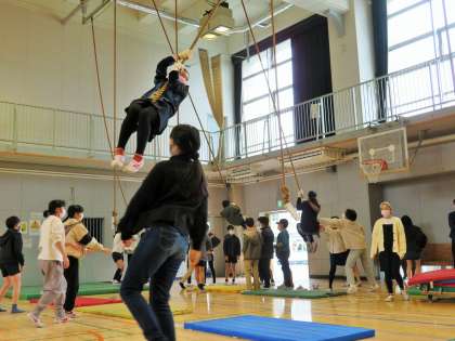 松丘小学校は、今年度より東京都教育委員会の新規事業である「体育健康教育推進校」(2年間)の指定を受け研究を進めています。そこで、期間限定で体育館をプレーパークにして遊んでいます。プレーパーク(冒険遊び場)は、子どもが「遊び」をつくる遊び場です。ターザンは大人気です!