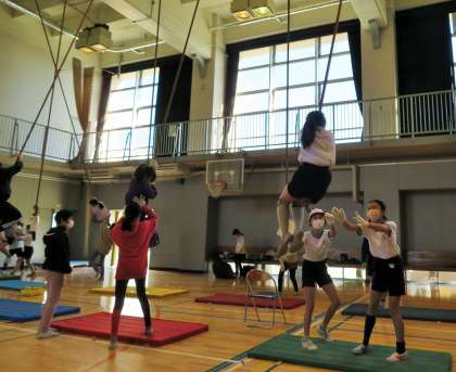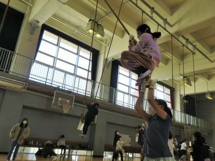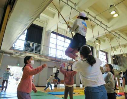 松丘小学校は、今年度より東京都教育委員会の新規事業である「体育健康教育推進校」(2年間)の指定を受け研究を進めています。そこで、期間限定で体育館をプレーパークにして遊んでいます。プレーパーク(冒険遊び場)は、子どもが「遊び」をつくる遊び場です。ターザンは大人気です!