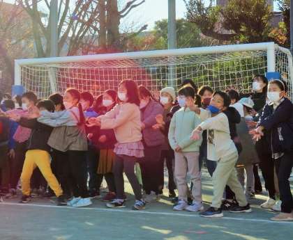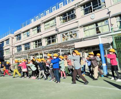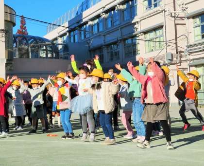 1年生もお手本のダンスを見ながら、軽快な音楽にからだを揺らしながら上手に踊っています。