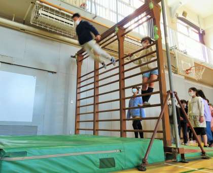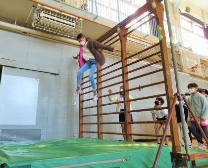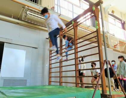 肋木に登りエバーマットにジャンプして遊んでいます。子どもたちが自由に安全に遊べるよう、遊び場の運営は私たち教職員が見守っています。