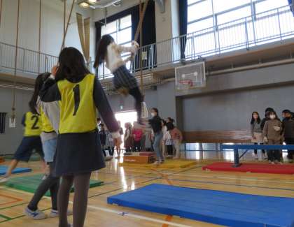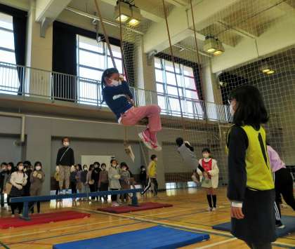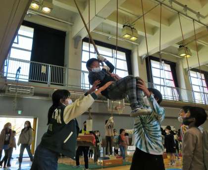 松丘小学校は、今年度より東京都教育委員会の新規事業である「体育健康教育推進校」(2年間)の指定を受け研究を進めています。そこで、期間限定で体育館をプレーパークにして遊んでいます。プレーパーク(冒険遊び場)は、子どもが「遊び」をつくる遊び場です。ターザンは大人気です!