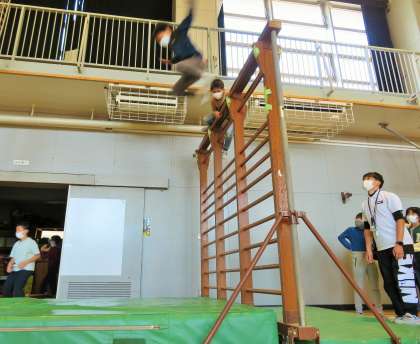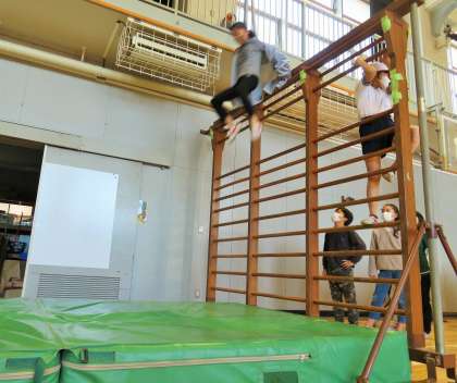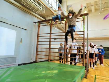 肋木に登りエバーマットにジャンプして遊んでいます。子どもたちが自由に安全に遊べるよう、遊び場の運営は高学年児童と私たち教職員が見守っています。