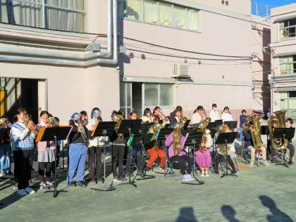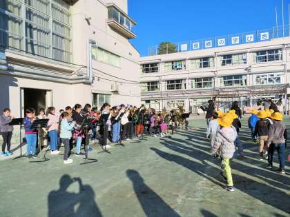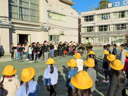 金管バンドの皆さんが、終業式において「校歌」と退場の曲「ジングルベル」の2曲を演奏しました。迫力ある演奏を聴きながら、子どもたちは憧れを抱きながら明るい表情で教室へと向かいました。金管バンドの皆さん、ありがとうございました!