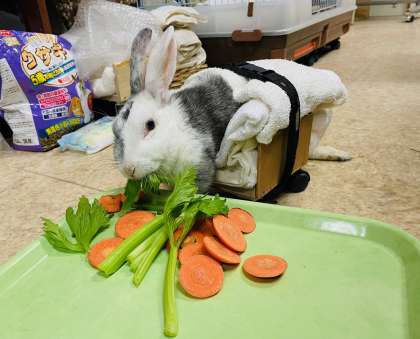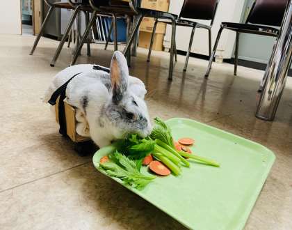 冬休み中も飼育委員の子どもたちと先生が、ウサギのお世話をしてくれています。ウサギに餌と水を与え、掃除をしてくれています。ウサギの健康状態も記録して引き継いでいます。ウサギのオセロは、高齢と背中から腰にかけて2箇所のヘルニアの影響で左半身不随の生活が続いています。昨年12月からは、医師の指示のもとに主事が製作した歩行器に乗り、ウサギ本来の姿勢でいられるよう、また少しでも自ら運動できるようにしています。食欲は一時期より戻ってきて旺盛ですので嬉しいです。オセロは寒い冬を乗り越えられるよう暖かい校長室で生活しています。飼育委員の皆さん、いつもありがとう!
