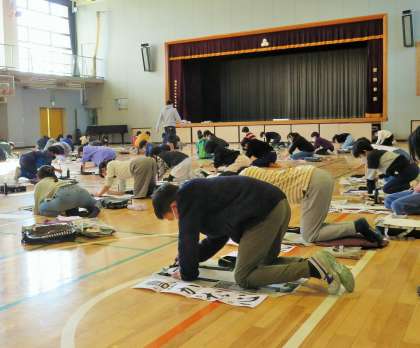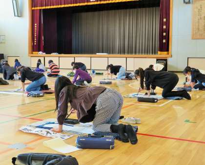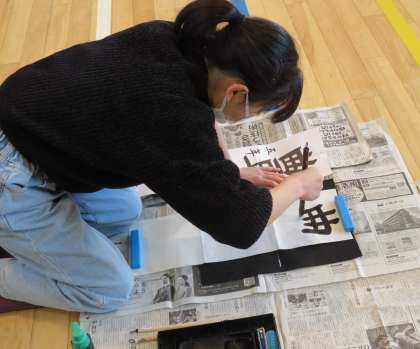 今日は5年生の席書会です。厳かな曲が流れている体育館は、ピーンと張りつめた空気で、私語は全くありません。先生からの話があり、書き初めがはじまりました。