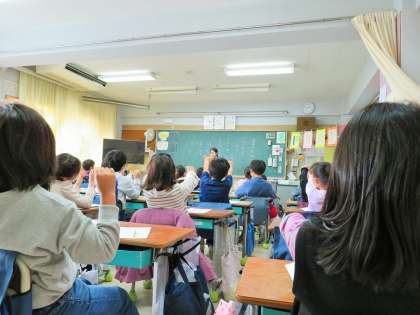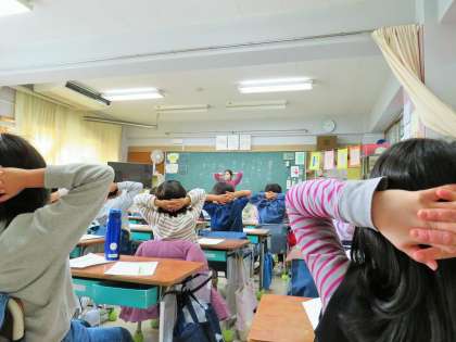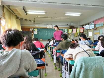 今日は2年生、硬筆での書き初めです。まずはポイントを確認し、腕や指の準備運動「書写体操」からスタートです。そして、心をしっかり落ち着かせてから書き始めました。