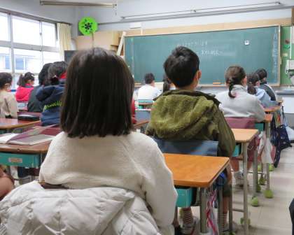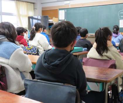 写真は、全校朝会の話を聞いている4年生の様子です。