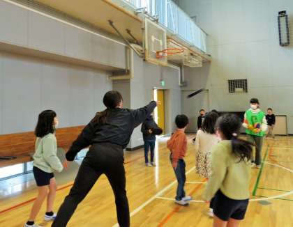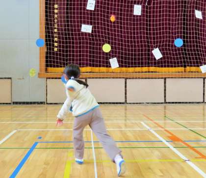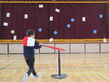 的をめがけて投げたりバットで打ったりして遊んでいます。先生も一緒に遊んでいて楽しそうです!