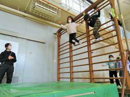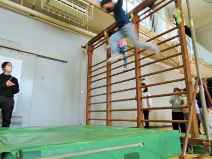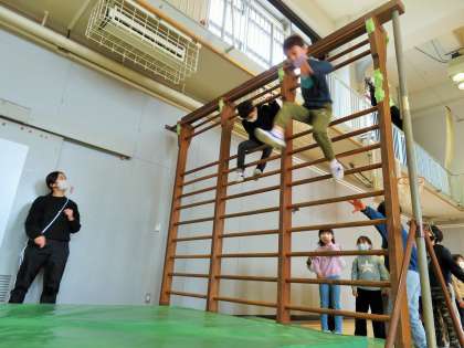 肋木に登りエバーマットにジャンプして遊んでいます。子どもたちが自由に安全に遊べるよう、遊び場の運営は高学年児童と私たち教職員が見守っています。