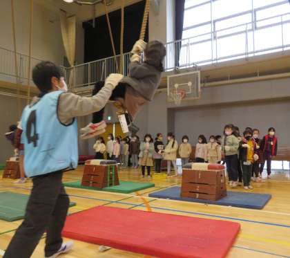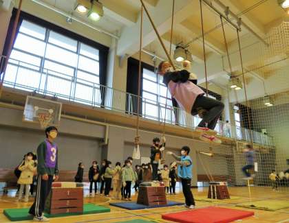 松丘小学校は、今年度より東京都教育委員会の新規事業である「体育健康教育推進校」(2年間)の指定を受け研究を進めています。そこで、期間限定で体育館をプレーパークにして遊んでいます。プレーパーク(冒険遊び場)は、子どもが「遊び」をつくる遊び場です。ターザンは大人気です!
