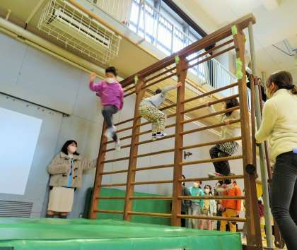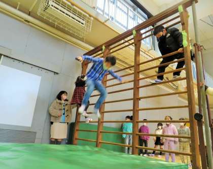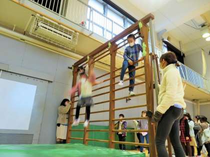 肋木に登りエバーマットにジャンプして遊んでいます。子どもたちが自由に安全に遊べるよう、遊び場の運営は高学年児童と私たち教職員が見守っています。