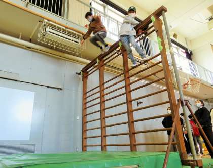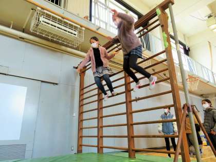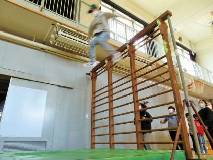 肋木に登りエバーマットにジャンプして遊んでいます。