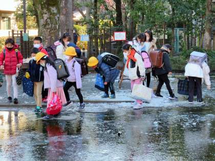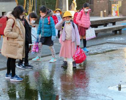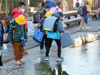 10年に一度といわれる最強寒波2日目の朝です。今日も南門で子どもたちを迎えていると「校長先生、来てきて・・・!」と呼ばれたので行ってみました。なんとそこには、鯉の池が凍っているのを楽しみにしている子どもたちが昨日以上に多く集まっていました。
