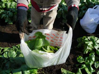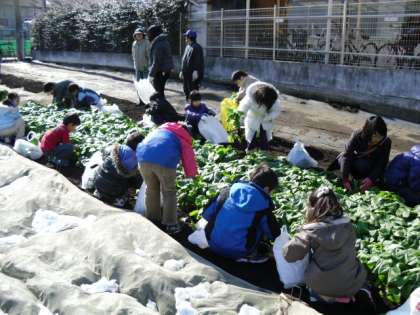 寒さに負けず、おいしさをいっぱい蓄えた小松菜を、みんなで一生懸命取りました。