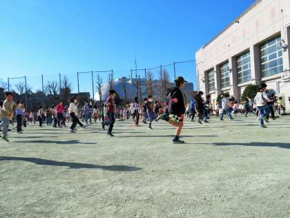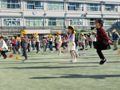 今日は1・3・6年生短縄朝会の最終回です。6年生の運動委員の子を手本に「リズム縄跳び」に取り組みました。基本的な前とび、後ろとび、駆け足とびなど、様々な跳び方を織り交ぜています。