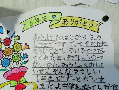 明日開催の「6年生を送る会」に向けて、それぞれの学年が準備を進めています。送る会の最後に6年生が花道として通る廊下には、気持ちのこもった掲示物を用意しています。