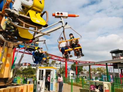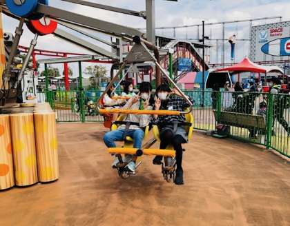 コンパスと色鉛筆の見た目がかわいらしい回転型のアトラクション。座席のペダルをこぐとライドが上昇する「くるくるコンパス」です!