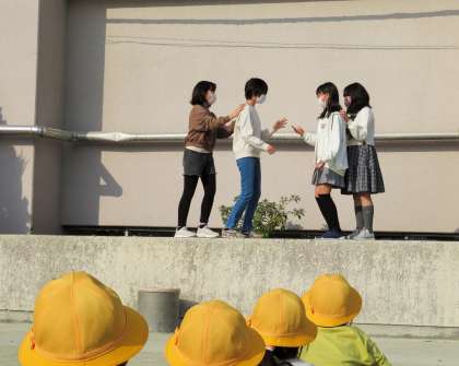 今朝の児童集会は集会委員会による「じゃんけん列車」集会です。まずは、ルール説明です。1年生と6年生、2年生と4年生に分かれてゲームの開始です。
