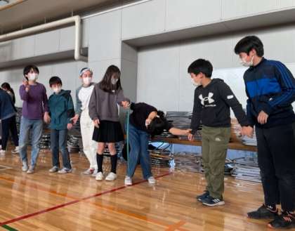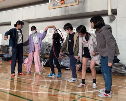 2つ目のゲームは、手を繋いでの「フラフープリレー」です。