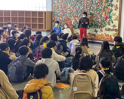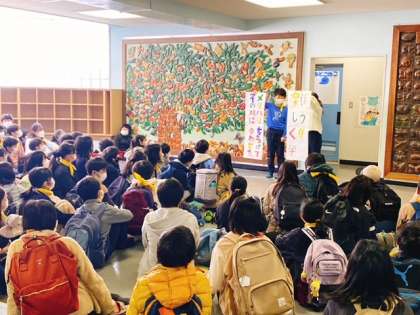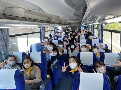 出発式、そしてバス車内の様子です。バス内は、プラズマクラスター搭載、5分で車内全体が新しい空気に入れ替わる「外気導入運転」を実施しています。