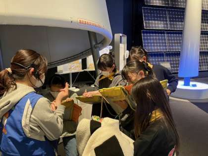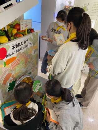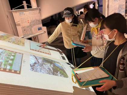 かわさきエコ暮らし未来館に戻り、展示スペースの見学です。地球温暖化対策、太陽光発電などの再生可能エネルギー、3Rなどの資源循環について、見て・聞いて・触って学べるスペースです。