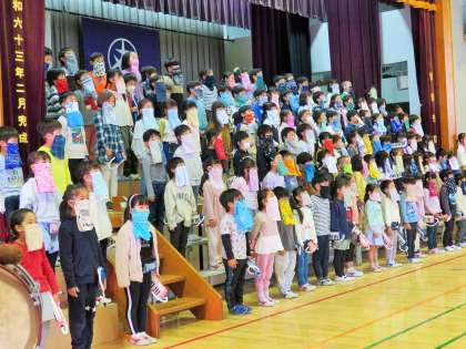 今日は、新2年生が入学式の「歓迎のことば」のリハーサルを行いました。新1年生への呼びかけや、1年間の学校生活「運動会」「縄跳び」「昔遊び」など、それぞれの取り組みを紹介しました。