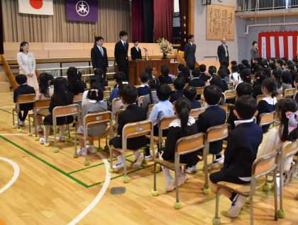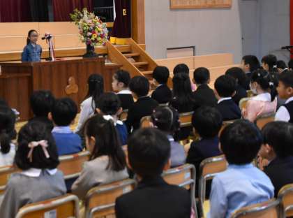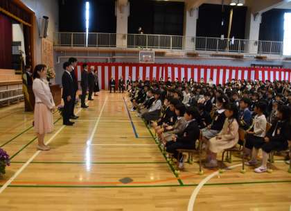 担任の先生の発表と、6年生代表児童による「歓迎の言葉」です。さすが松丘小学校の6年生です。1年生が安心できる、心のこもった歓迎の言葉でした。