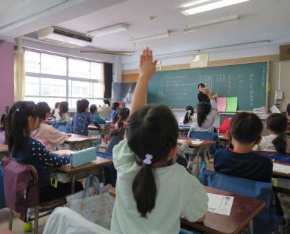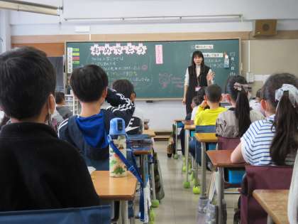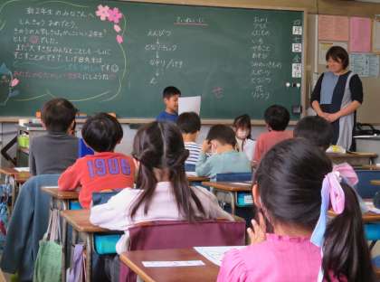 今日は、各クラスで担任の先生や子どもたちの自己紹介からスタートです。好きな食べ物、好きな勉強や運動、今年の目標などを一人ひとりがしっかりと発表しました。発表した友達に、互いに大きな拍手を送っていました。