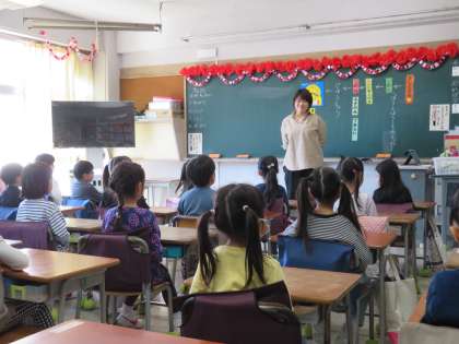 写真は、6年生のあいさつ当番と放送朝会を聞いている1年生の様子です。