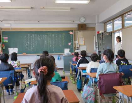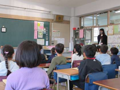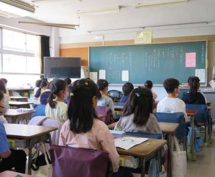 写真は、放送朝会を聞いている2年生の様子です。